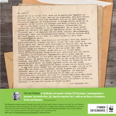 Mit einer Anzeigenserie in der Wochenzeitung Die Zeit will der Umweltverband WWF neben Fakten zum Klimawandel auch Emotionen sprechen lassen: Elf Künstlerinnen und Künstler lassen eindrucksvolle Bilder und ungewohnte Worte sprechen