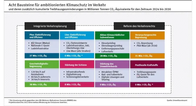 Abbildung 1: Wirkung verschiedener Maßnahmenpakete auf den Ausstoß von Treibhausgasen im deutschen Verkehrssektor. Bei den Zahlen sind die Effekte der Einzelmaßnahmen in jedem Paket über die Jahre 2024 bis 2030 aufsummiert; Quelle: UBA 2024