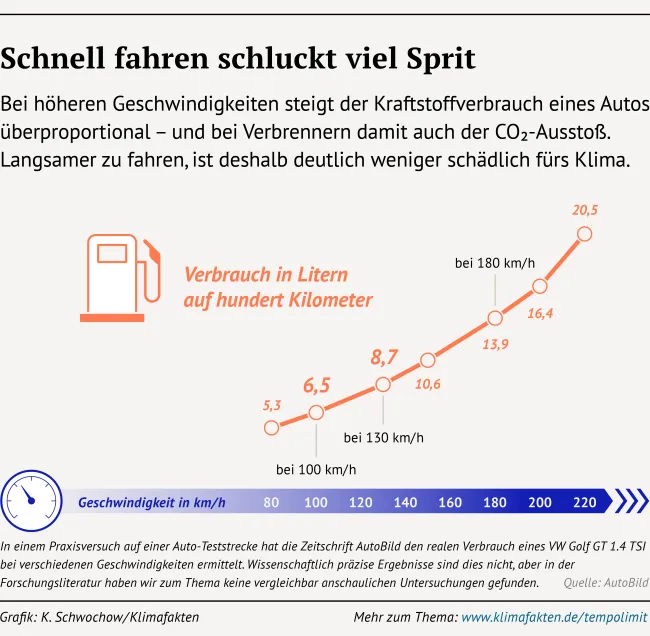 Benzin und Diesel bestehen aus Kohlenwasserstoffen. Werden die beiden Kraftstoffe in einem Motor verbrannt, reagiert der enthaltene Kohlenstoff mit Sauerstoff zu Kohlenstoffdioxid (CO₂). Je schneller ein Fahrzeug fährt, desto mehr Kohlenwasserstoffe, also Benzin oder Diesel, werden verbraucht, damit genug Leistung zur Verfügung steht, um den Luftwiderstand zu überwinden. Dieser Widerstand steigt ungefähr quadratisch mit der Geschwindigkeit, das heißt: Mit jedem zusätzlichen Stundenkilometer steigt die Energieverbrauchskurve immer steiler an und damit (bei Verbrennerfahrzeugen) der Benzin- bzw. Dieselverbrauch und damit der CO2-Ausstoß.