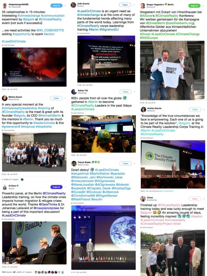 Das Climate Reality Project veranstaltet solche Trainings seit mehr als zehn Jahren überall auf der Welt. Das erste fand auf Gores Grundstück in Tennessee statt, die 38. Veranstaltung in Berlin ist die erste in Mitteleuropa. Die Teilnahme ist kostenlos, es gibt viel mehr Bewerber als Plätze. Die Absolventen bekommen am Ende der Veranstaltung in Berlin den Titel "Climate Leader" verliehen, sie sollen dafür später zehnmal im Jahr unbezahlte Vorträge halten, Veranstaltungen organisieren, Blog-Einträge schreiben oder "Influencer" wie Politiker und Journalisten kontaktieren. Unter den Teilnehmern sind auch Frauen mit grauem und Männer mit wenig Haar, aber die meisten sind jung, um die 30 vielleicht. Für sie geht es tatsächlich um die eigene Zukunft, sie sprechen daher mit Inbrunst von der "existentiellen Krise", die der Klimawandel für sie bedeutet.