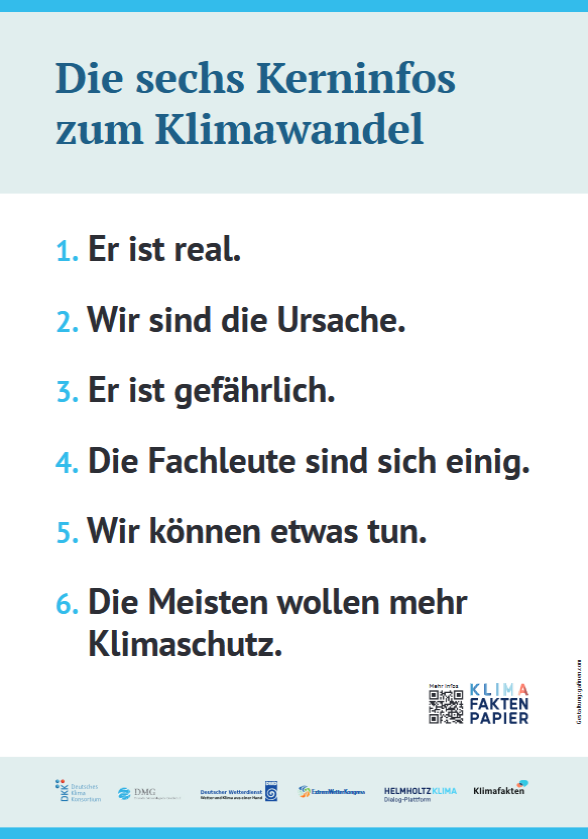 Ebenfalls seit 2020 enthält die Broschüre etwas, das wir uns bei einem der wichtigsten Experten für Klimakommunikation weltweit abgeschaut haben. Anthony Leiserowitz, Chef des Yale Program on Climate Change Communication (YCCC) hatte es vor etlichen Jahren geschafft, die fünf Kernbotschaften zum Klimawandel in nur zehn (englischen) Worten auf den Punkt zu bringen: "It's real. It's us. It's bad. Experts agree. There's hope." Die Idee dahinter: Das schwierige Thema, das viele Menschen in seiner Komplexität überfordert, auf einen leicht merkbaren Kanon zusammenschnurren zu lassen. Zuletzt kamen noch zwei weitere Worte, kam eine sechste Botschaft hinzu: "Others care." (Also dass auch viele andere Menschen sich ums Klima sorgen, auch wenn das in öffentlichen Debatten manchmal nicht so scheinen mag, wo sich oft lautstarke Bremser, Gegner und Leugner in den Vordergrund drängen.)