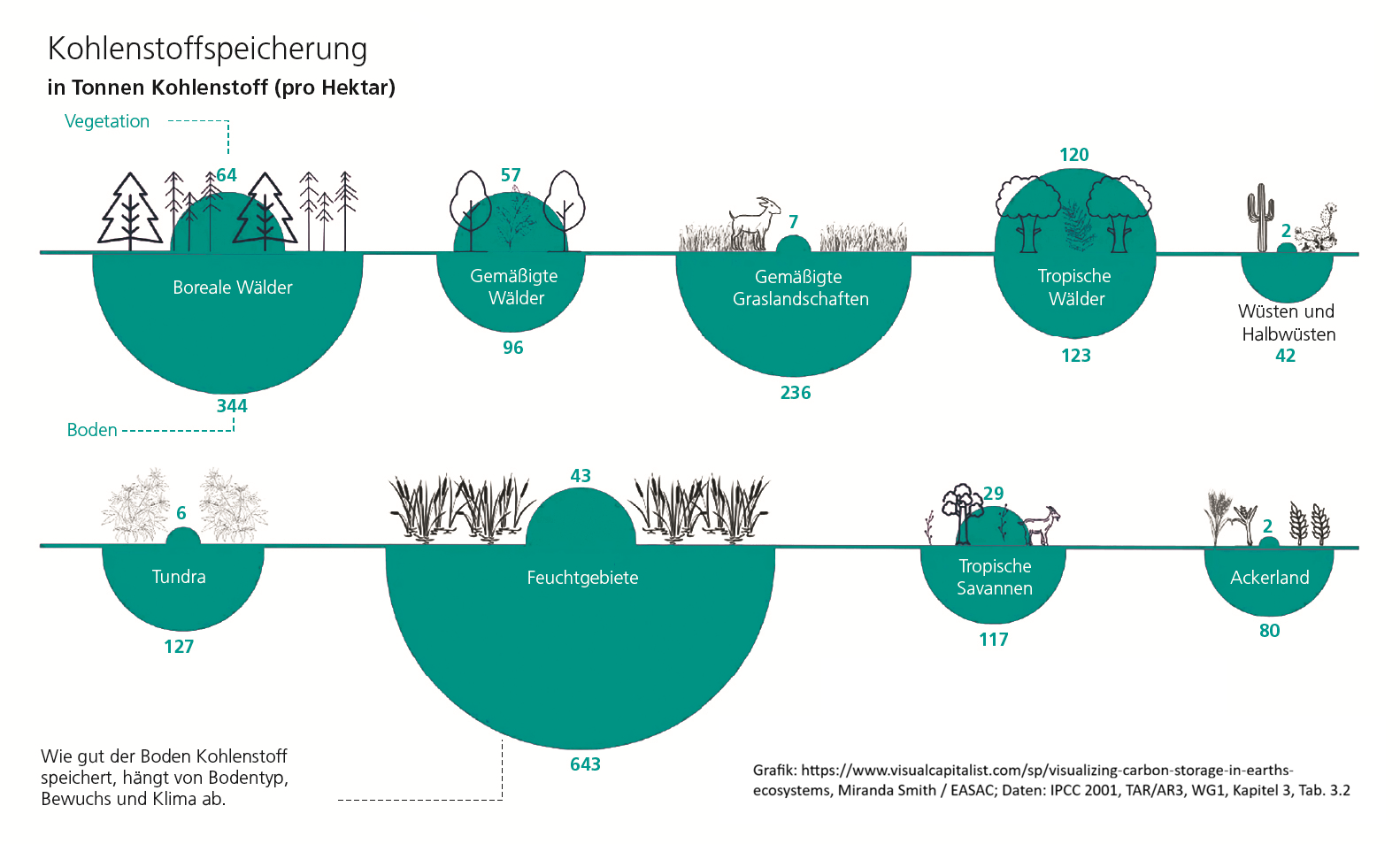 Was kaum jemand weiß: In praktisch allen Land-Ökosystemen ist unter der Erdoberfläche mehr Kohlenstoff gebunden als in der oberirdischen Vegetation (siehe Grafik). Weltweit ist in Böden eine unfassbare Menge von mehr als 2.000 Milliarden Tonnen gebunden; in Deutschland zum Beispiel speichern allein die landwirtschaftlich genutzten Böden rund doppelt so viel Kohlenstoff wie alle Wälder.