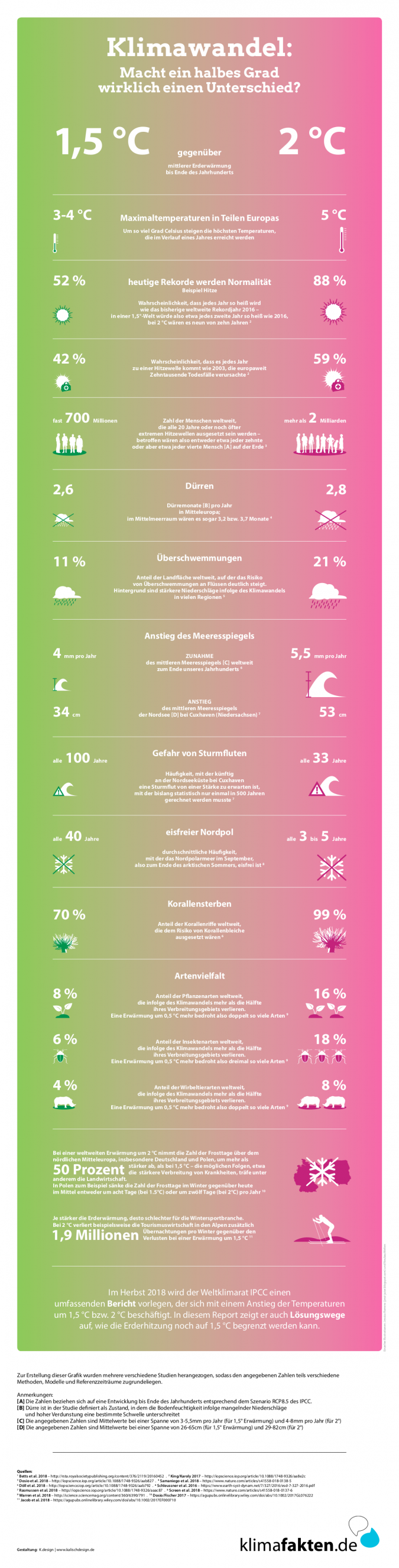 Für diese Infografik hat klimafakten.de rund ein Dutzend Untersuchungen ausgewertet. Viele weitere fließen in einen Sonderbericht ein, den momentan der Weltklimarat IPCC erarbeitet. Tausende Wissenschaftlerinnen und Wissenschaftler haben hierfür die Forschungsliteratur zum Thema gesichtet, ihre Verlässlichkeit bewertet und einen Überblick verfasst. Der Report wird Anfang Oktober 2018 erscheinen und - neben dem Blick auf die Unterschiede bei den Klimafolgen - auch Möglichkeiten aufzuzeigen, wie das 1,5-Grad-Limit noch gehalten werden könnte.