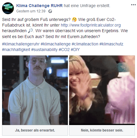 ... denn diese verbreiten sich schneller als ausführliche, detailreiche Texte und bleiben länger im Gespräch. Anna Deisenhofer von der Energieagentur Rheinland-Pfalz GmbH sagt dazu: "Wir haben gute Erfahrungen mit Abstimmungen auf Facebook gemacht, so können wir uns auch Meinungsbilder einholen. Videos werden immer gerne geklickt, Live-Fragestunden werden auch immer gut angenommen." (Die Abbildung links zeigt ein Beispiel für interaktive Klima-Kommunikation auf der Facebook-Seite des Regionalverbands Ruhr, RVR).