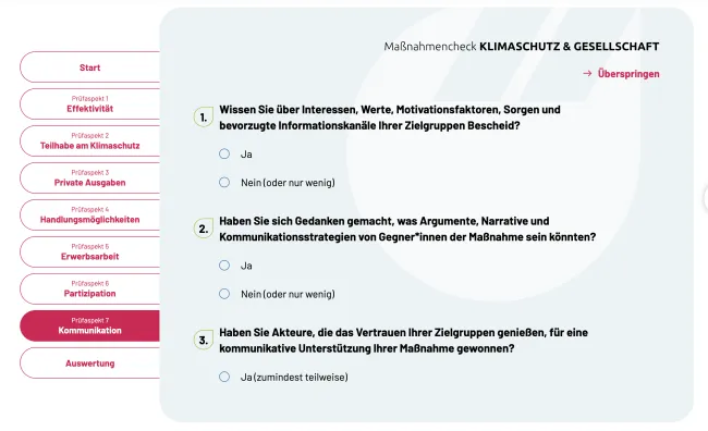 Aufbauend auf den Ergebnissen des Projekts haben wir den „Maßnahmencheck Klimaschutz & Gesellschaft“ entwickelt. Das kostenfrei verfügbare Online-Tool möchte Akteure dabei unterstützen, neue Maßnahmenideen für den Klima- und Umweltschutz so auszugestalten und zu kommunizieren, dass gesellschaftliche Akzeptanz-, Gerechtigkeits- und Motivationsfaktoren frühzeitig berücksichtigt werden.